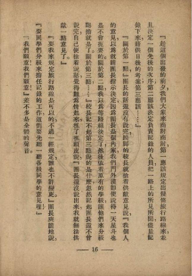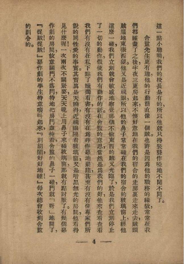 我們學校裹的敎職員們的姿態眞是無奇不有不知道校長先生是從那裏物色得來的就從校長說起吧校長自己是一個跛子走起路來一類一簸地活像一隻小船在水面上漾在我們同學中間有幾個愛鬧的人每當遠遺地看見校長先生在一搖一擺地走近來的時候『讓開讓開船來了船來了』這樣高聲地嚷着但當校長走近身邊的時候每一個人就都肅靜迴避地一字兒站看恭恭敬敬地目送校長走過使他辨認不出是誰曾經喊嚷過的所以校長雖然在老遠就聽見這樣的喊聲但因為這隻船搖不快他也就無法審查出來了的確他又不能夠提起來向每一個學生查問究竟是有損尊嚴的事