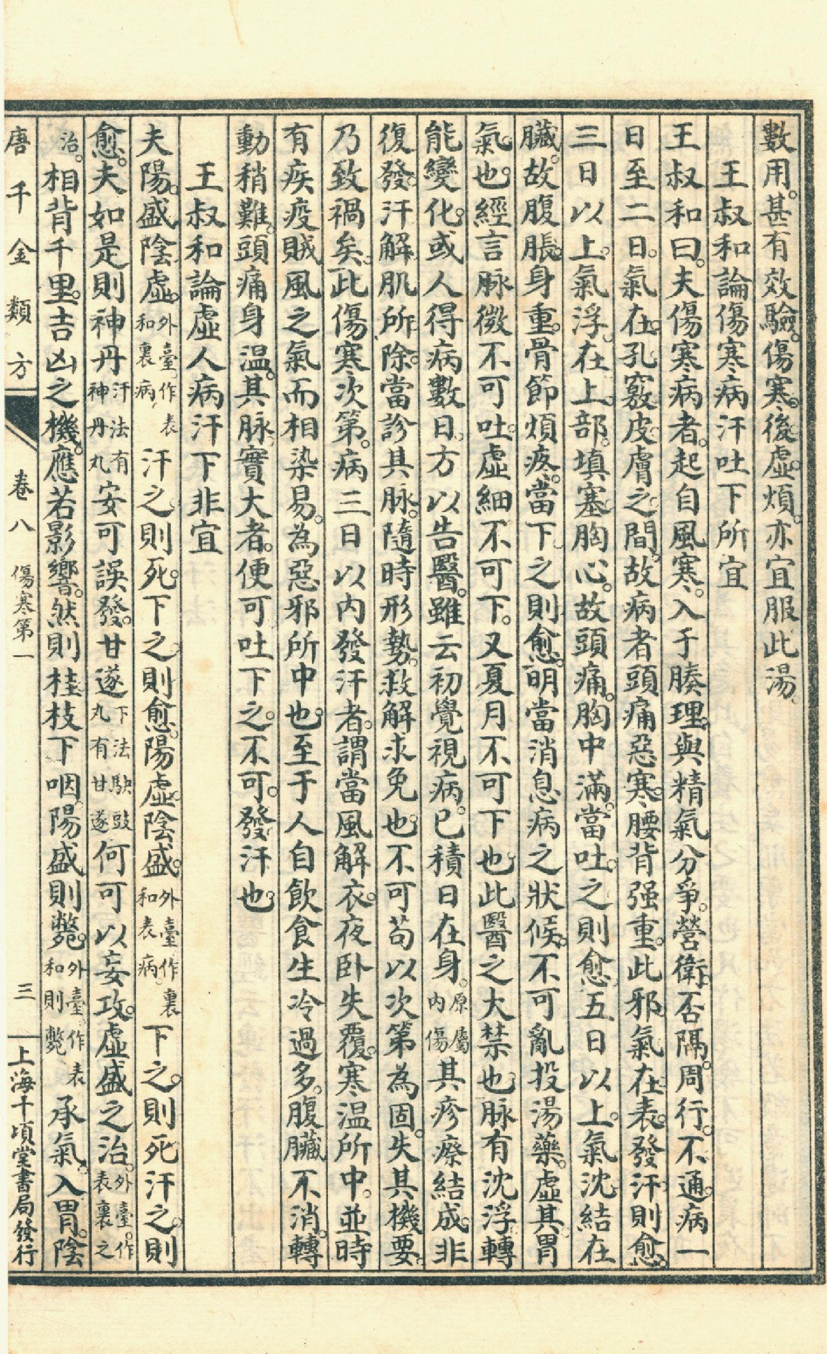本书由黃幹南編述 黃悌君校對 陳景山䨱校,共24卷,这是第8卷。黄孝廉幹南世丈,萃六年精力,凡五易藁,成唐千金類方二十七卷,都數十餘萬言,偉哉斯觀。夫易稱方以類聚,疏謂方為法術性行,術性之同者,以類而聚,可云類方之祖。論語言能近取譬,可謂仁之方,方取諸近,推類至盡,此亦類方之義。夫醫,仁術也,有術不可無方,有方不可無類。醫術肇自歧黄,遞隋之巢氏病源,而術益演。醫方始自長沙,遞唐之孫氏千金,而方益備。巢氏有論無方,孫氏本巢論而作千金,方術合一矣。惟近世醫師,有愛讀千金方者,輒以有方無類,淄澠淆混,令讀者不知其所以讀,此千金之厄也。幹丈有見及此,爰以巢源之病理,考千金之制劑,合勘分觀,舉綱張目,成此鉅製,用餉後學。今而後孫氏千金有方有類,讀者不病尋檢,其有助于醫林,豈曰小補之哉?且不僅便尋檢已也。龍宫祕義由是而傳,華原仁術因之益顯,此著者之苦心也。抑尤有説,醫為通天徹地之學,必有數十年之極深研幾,復證諸實驗,始可以言著作。幹丈醫學紹自庭訓,醫宗經論,早嵗成誦,壯習舉業,無間研索。戊申、已酉間,同官京曹,竝寓邑館,目覩其斗室書城,强半醫籍,昏燈點讀,目眵不輟,凍筆批評,手鞁屢呵,董生帷園、江泌月燈,殊未足喻其刻苦。時值民政設部,當軸採聲,任以醫職,日訂方案,數輙逾百,理症互證,學厯交資,如是者有年,乃掬其心得,與世相見,猶比于述而不作之先訓,以類方名書,雖曰未作,其功倍勤于作矣。