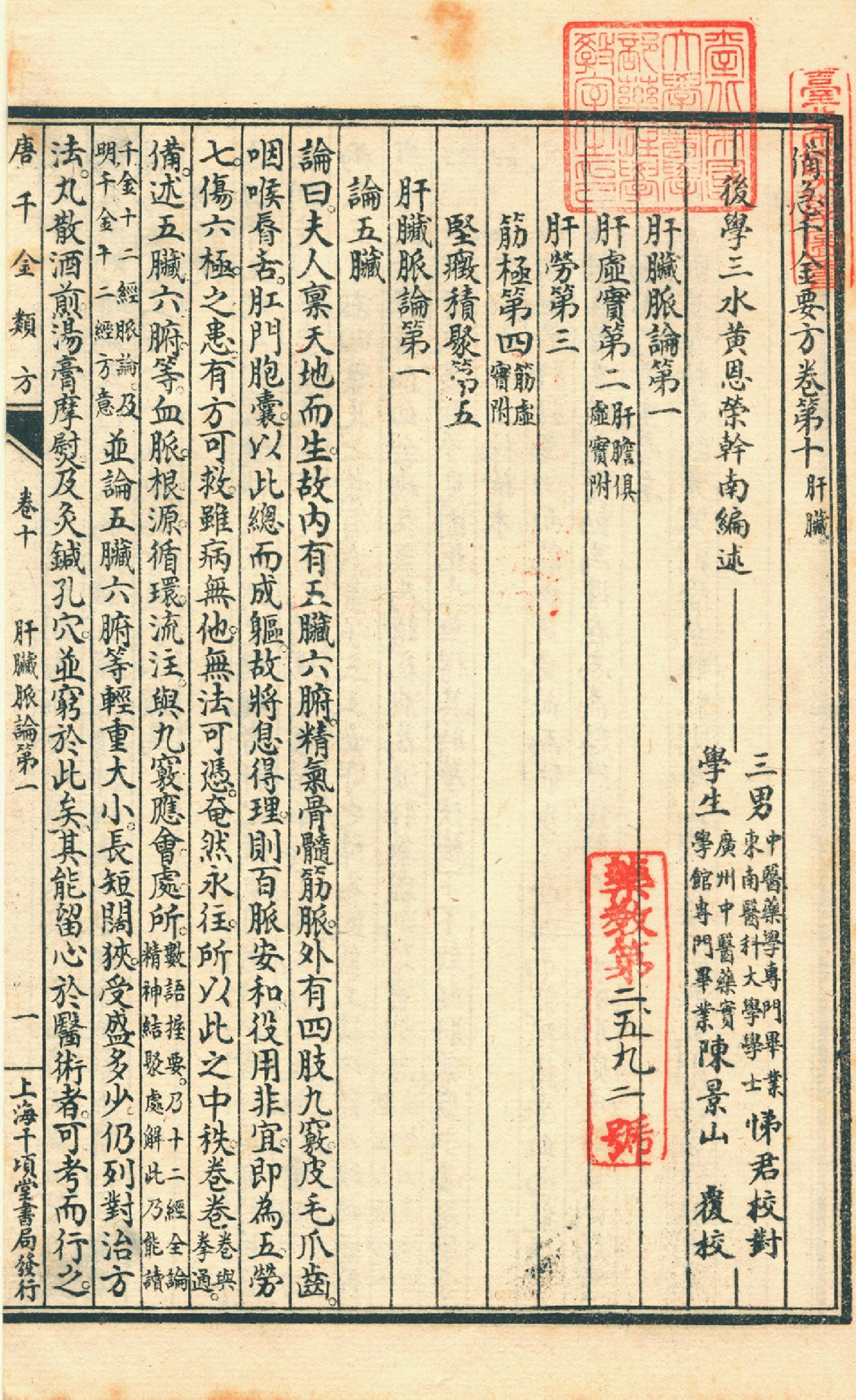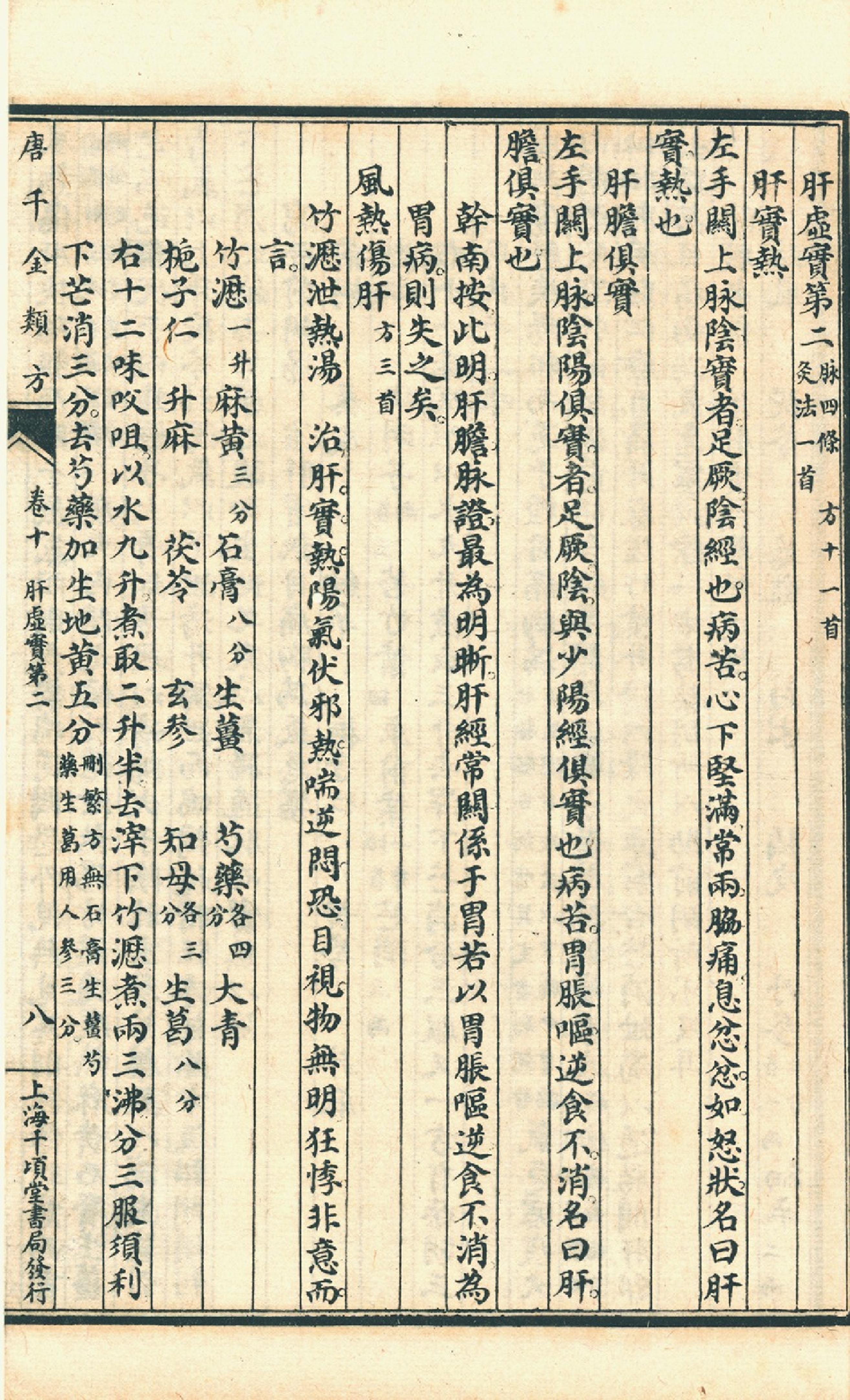 本书由黃幹南編述 黃悌君校對 陳景山䨱校,共24卷,这是第10卷。黄孝廉幹南世丈,萃六年精力,凡五易藁,成唐千金類方二十七卷,都數十餘萬言,偉哉斯觀。夫易稱方以類聚,疏謂方為法術性行,術性之同者,以類而聚,可云類方之祖。論語言能近取譬,可謂仁之方,方取諸近,推類至盡,此亦類方之義。夫醫,仁術也,有術不可無方,有方不可無類。醫術肇自歧黄,遞隋之巢氏病源,而術益演。醫方始自長沙,遞唐之孫氏千金,而方益備。巢氏有論無方,孫氏本巢論而作千金,方術合一矣。惟近世醫師,有愛讀千金方者,輒以有方無類,淄澠淆混,令讀者不知其所以讀,此千金之厄也。幹丈有見及此,爰以巢源之病理,考千金之制劑,合勘分觀,舉綱張目,成此鉅製,用餉後學。今而後孫氏千金有方有類,讀者不病尋檢,其有助于醫林,豈曰小補之哉?且不僅便尋檢已也。龍宫祕義由是而傳,華原仁術因之益顯,此著者之苦心也。抑尤有説,醫為通天徹地之學,必有數十年之極深研幾,復證諸實驗,始可以言著作。幹丈醫學紹自庭訓,醫宗經論,早嵗成誦,壯習舉業,無間研索。戊申、已酉間,同官京曹,竝寓邑館,目覩其斗室書城,强半醫籍,昏燈點讀,目眵不輟,凍筆批評,手鞁屢呵,董生帷園、江泌月燈,殊未足喻其刻苦。時值民政設部,當軸採聲,任以醫職,日訂方案,數輙逾百,理症互證,學厯交資,如是者有年,乃掬其心得,與世相見,猶比于述而不作之先訓,以類方名書,雖曰未作,其功倍勤于作矣。