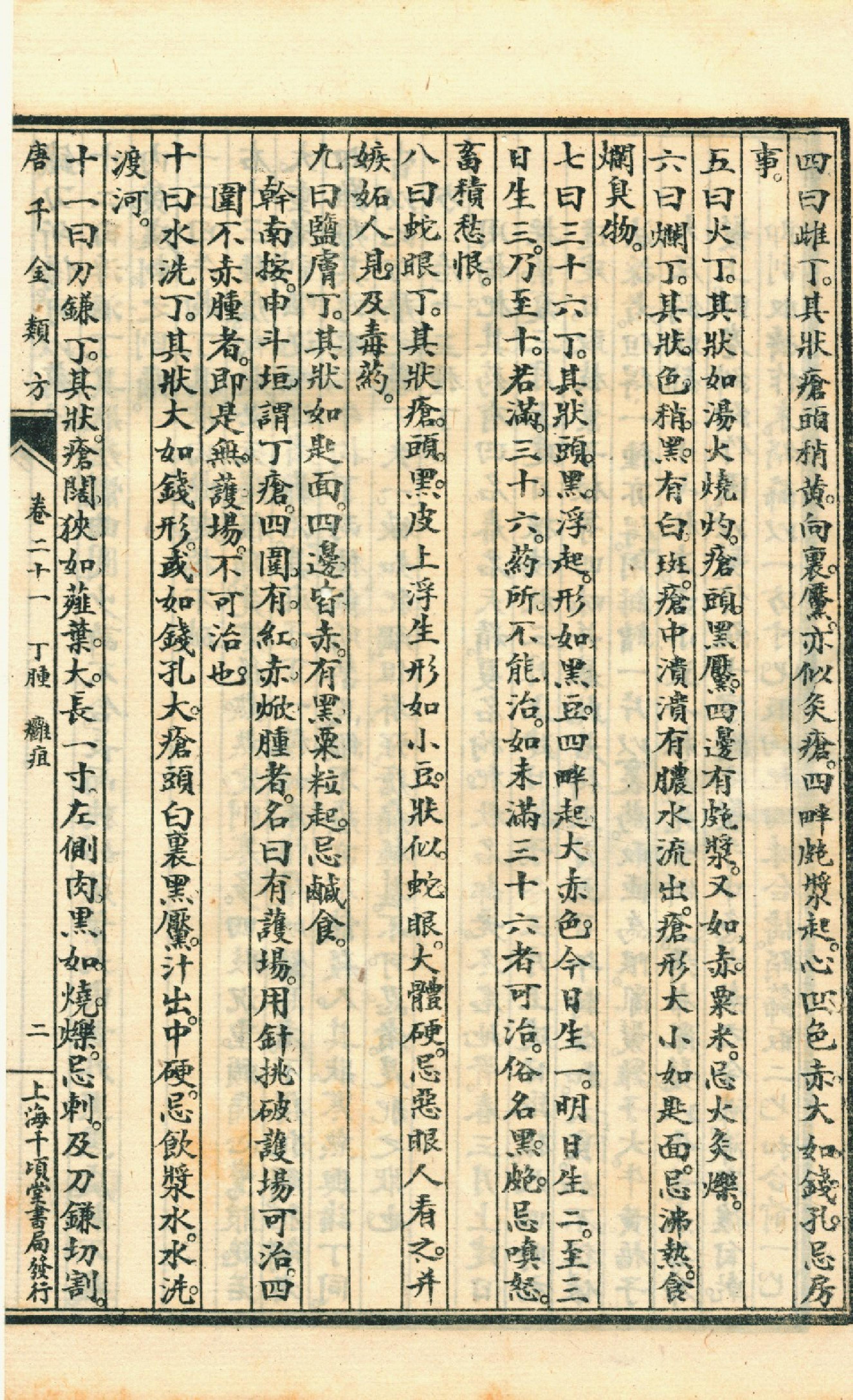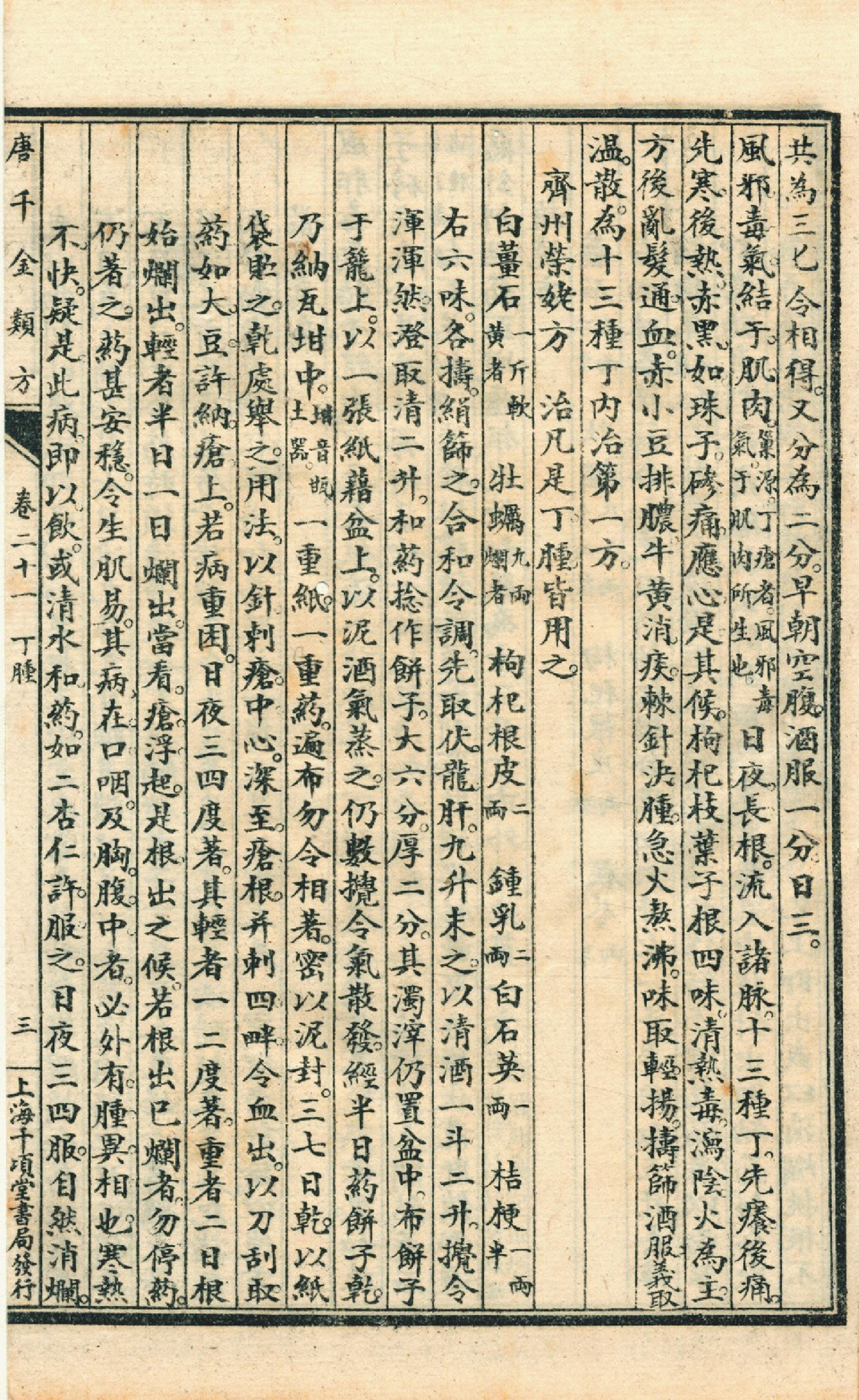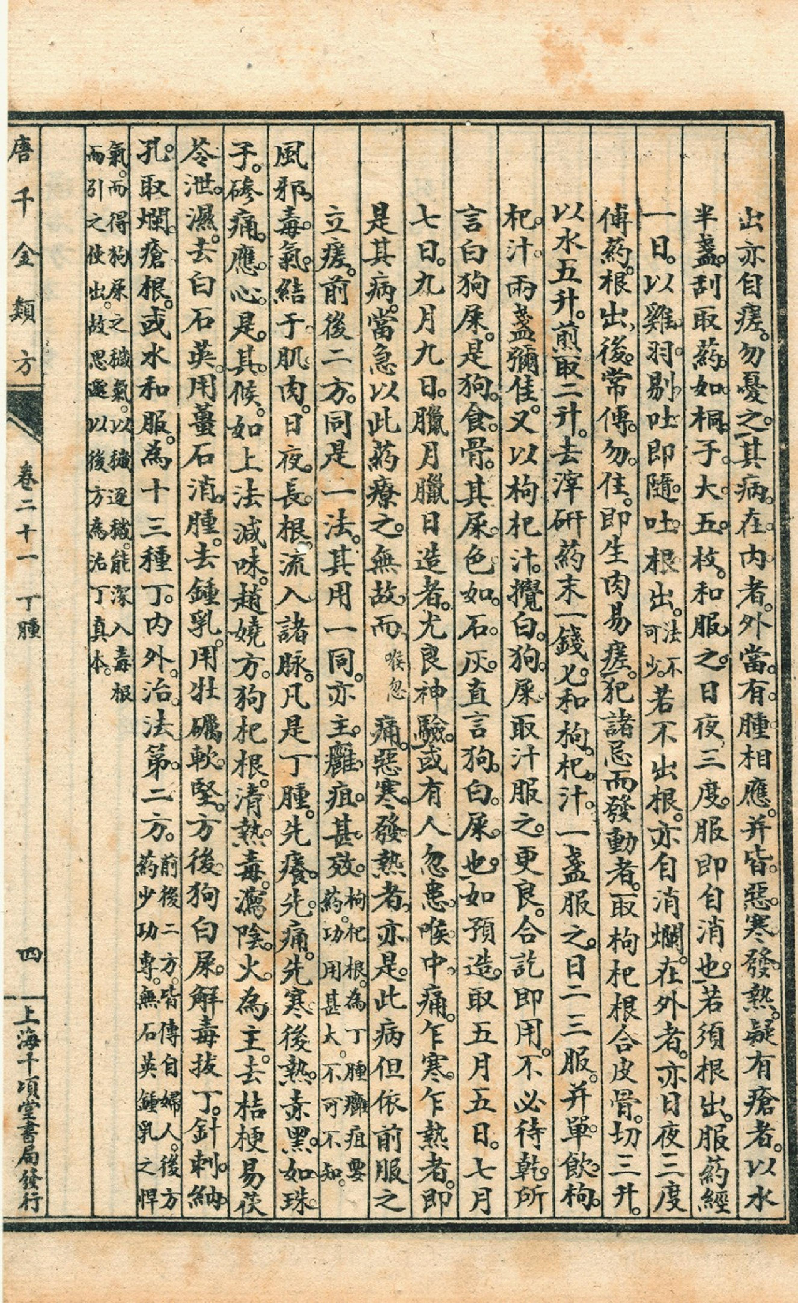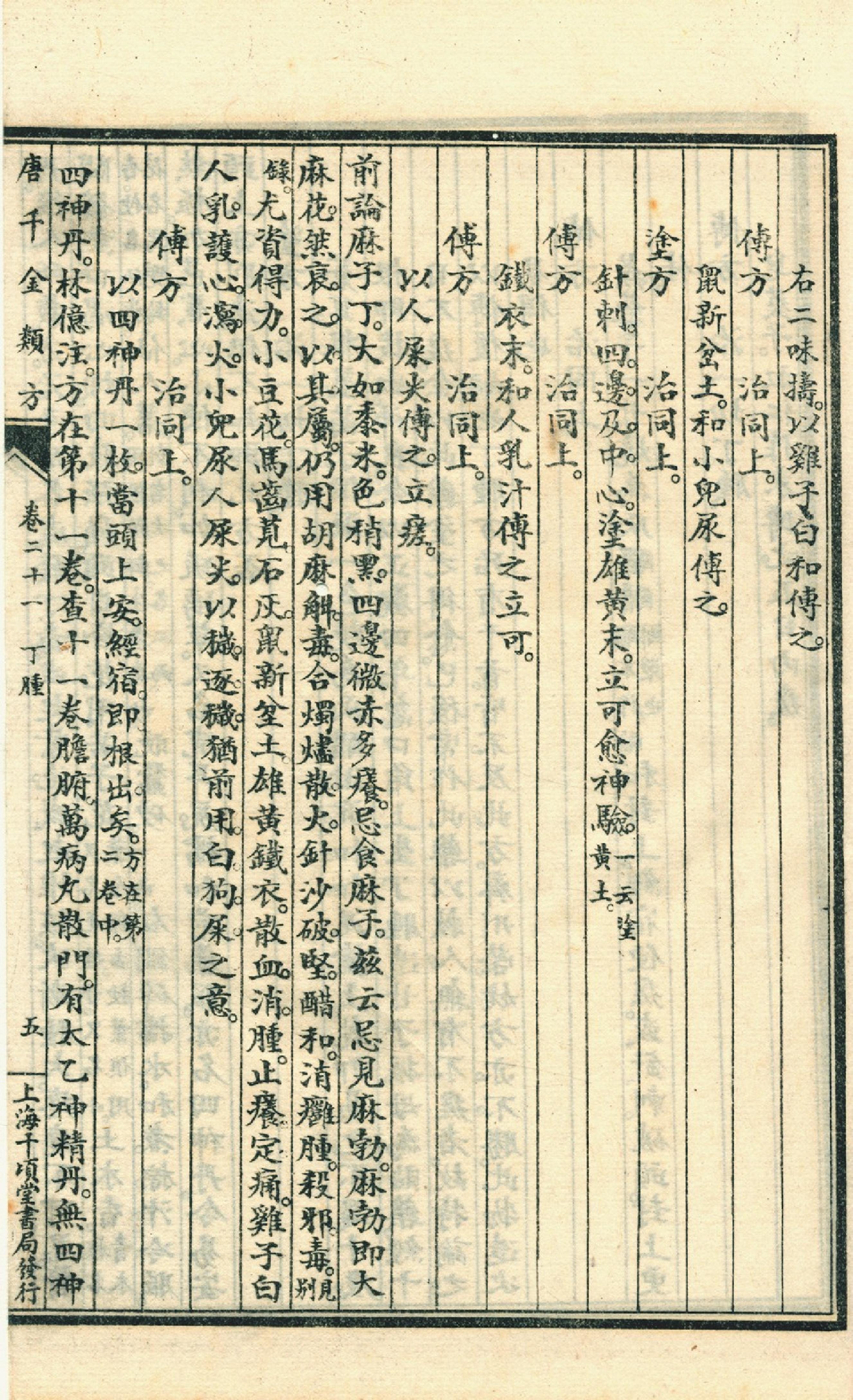 本书由黃幹南編述 黃悌君校對 陳景山䨱校,共24卷,这是第21卷。黄孝廉幹南世丈,萃六年精力,凡五易藁,成唐千金類方二十七卷,都數十餘萬言,偉哉斯觀。夫易稱方以類聚,疏謂方為法術性行,術性之同者,以類而聚,可云類方之祖。論語言能近取譬,可謂仁之方,方取諸近,推類至盡,此亦類方之義。夫醫,仁術也,有術不可無方,有方不可無類。醫術肇自歧黄,遞隋之巢氏病源,而術益演。醫方始自長沙,遞唐之孫氏千金,而方益備。巢氏有論無方,孫氏本巢論而作千金,方術合一矣。惟近世醫師,有愛讀千金方者,輒以有方無類,淄澠淆混,令讀者不知其所以讀,此千金之厄也。幹丈有見及此,爰以巢源之病理,考千金之制劑,合勘分觀,舉綱張目,成此鉅製,用餉後學。今而後孫氏千金有方有類,讀者不病尋檢,其有助于醫林,豈曰小補之哉?且不僅便尋檢已也。龍宫祕義由是而傳,華原仁術因之益顯,此著者之苦心也。抑尤有説,醫為通天徹地之學,必有數十年之極深研幾,復證諸實驗,始可以言著作。幹丈醫學紹自庭訓,醫宗經論,早嵗成誦,壯習舉業,無間研索。戊申、已酉間,同官京曹,竝寓邑館,目覩其斗室書城,强半醫籍,昏燈點讀,目眵不輟,凍筆批評,手鞁屢呵,董生帷園、江泌月燈,殊未足喻其刻苦。時值民政設部,當軸採聲,任以醫職,日訂方案,數輙逾百,理症互證,學厯交資,如是者有年,乃掬其心得,與世相見,猶比于述而不作之先訓,以類方名書,雖曰未作,其功倍勤于作矣。