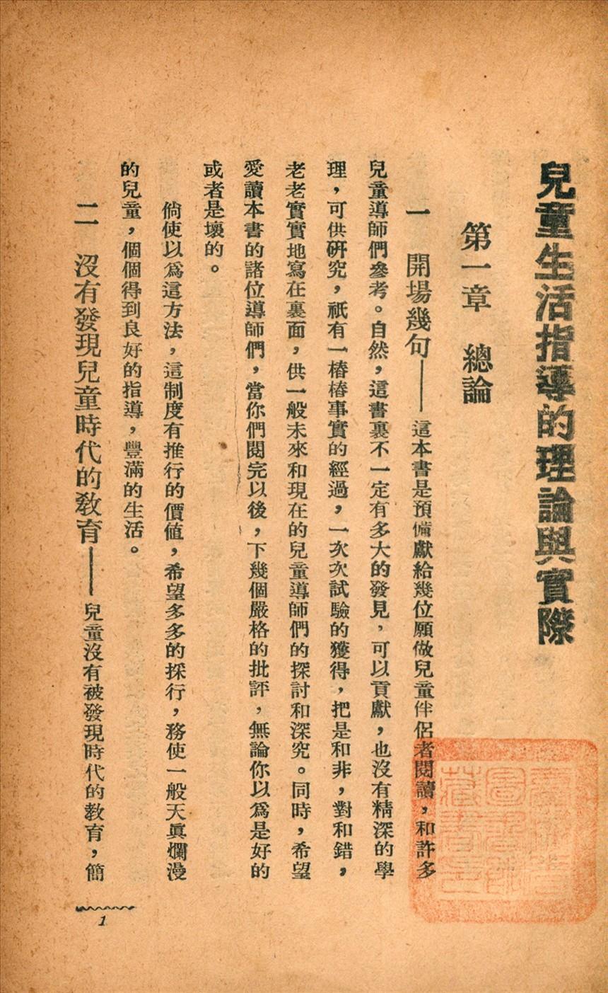 這本小册子,是在京女中實小和通中實小裏,實地試驗出來的花兒和果兒。今以十二萬分的熱誠,將這花兒和果兒,謹獻于兒童導師之前。 當然,這裏對于生指導,在學理上不一定有多大的發見,不過將試驗的獲得·作一個系統的報告,即此或許亦足以供給導師們的參考罷。同時吾們將兒童自治過去的病態,赤裸裸的暴露出來,去唤醒導師們的迷夢,和糾正他們的錯誤:並且希望他們,個個能夠回頭,向着兒童生活指導的正途進發。