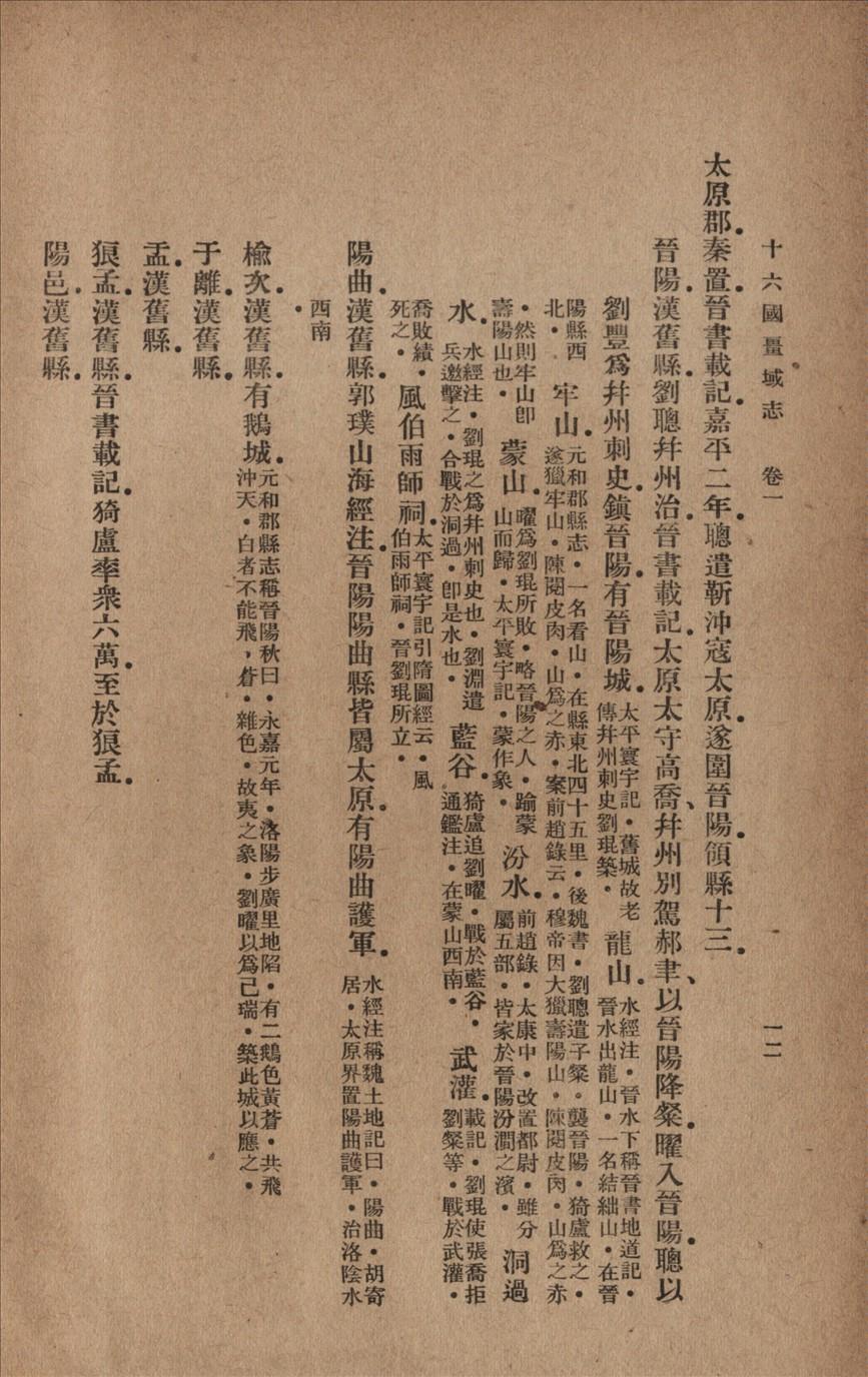 阳湖洪亮吉撰。十六国疆域志,固与东晋疆域相辅而行者也。然志十六国之难,则更难于东晋。何则?其窃据之久者,不过数十年,少则止十数年。刘曜续开之州郡,既迥异于渊聪;石虎晚定之山河,又大逾于襄国。甚者姚苌以马牧起事,故崇镇保之势,以敌方州;赫连以统万建基,故芟郡县之名,尽归城主。后先错出,彼此互殊,纵欲指陈,殊难画一。一也。近时崔鸿十六国春秋,既系明人所辑,不足据凭。惟太平御览中所录,及诸舆地图经所引,尚属当日旧书,而简略特甚,十止二二三。晋书载记,又非详核,是依据者少。二也。当时霸史之见于隋唐经籍志者,有常璩汉之书十卷,旧唐书作蜀李书九卷,田融赵书十卷,旧唐书作赵石记二十卷,王度二石传二卷,旧唐书作不著名二石记二十卷,又二石为事二卷,旧唐书作六卷,范章燕书二十卷,张诠南燕录五卷,王景晖南燕录六卷,游览先生南燕书七卷,高闾燕志十卷,何神熙秦书八卷,席惠明秦记十一卷,姚和都秦纪十卷,张咨凉记八卷,旧唐书作十卷,刘景凉书十卷,史喻归西河记二卷,旧唐书作段龟龙,误饮。段龟龙凉记十卷,高道让凉书十卷,沮渠国史凉书十卷,无名氏拓跋凉录十卷,刘景敦煌实录十卷,和苞汉赵记十卷,吐谷浑记二卷,翟辽书二卷,诸国略记二卷,永嘉后纂年纪二卷,段业传一卷,南宋时巳渐次散失,是所搜采者尽十三也。卽有附见于晋…..