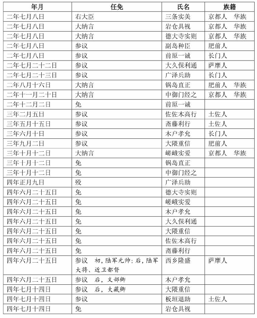 自将军奉还政权,其时主少国疑,未能收太阿之柄归于独断,不得不仍以西京世族、强藩巨室参与政事,故太政官之权特重。日本官职不叙正一位。当中叶时,国皇每亲临政所裁决万机,盖太政官中即以国皇居首坐,然其事出于御裁者少矣。副岛、板垣之请起民撰议院也,谓方今政权上不在帝室,下不在人民,而独归于有司。此论一倡,众口嚣嚣,群欲仿西法以开国会。或斥为巨藩政府,或指为封建余威,虽出于嫉妒怨忿者之口,然萨、长、肥、土皆于国家有大勋劳,一国之大权必有所归,势重者权归之,固有不得不然者在乎?今特谱维新以来大臣、参议更替表,俾觇国势者览观焉。