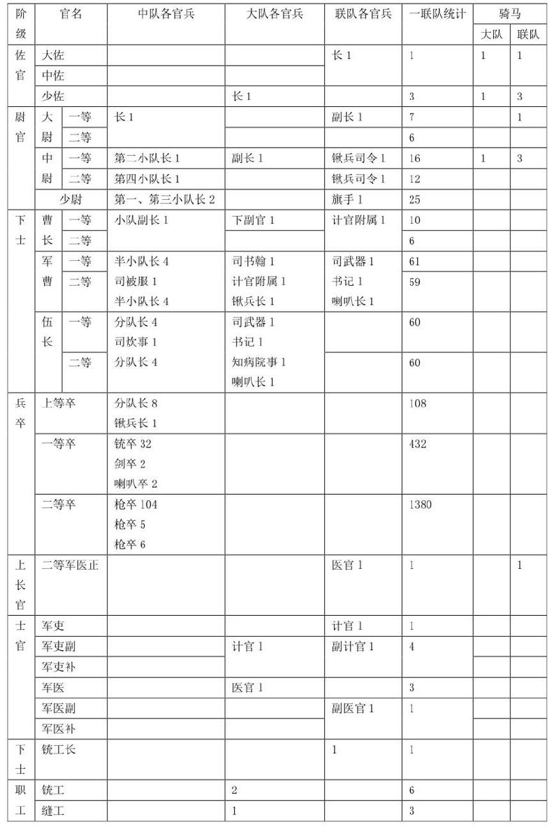 步兵兵卒,以一百六十人为一中队。此表中中队内所列上等、一等、二等卒共百六十人,即其数也。其余为统兵之官。四中队为一大队,三大队为一联队,兵卒之由小队而中队,由中队而大队,以倍数算。统兵者由小队而中队,由中队而大队,以递加之数算。大队格内所列一十六人,专记统兵之官,至兵卒之数第比中队增加一倍,故不复记。联队,格内依例推之。