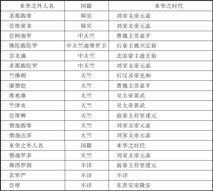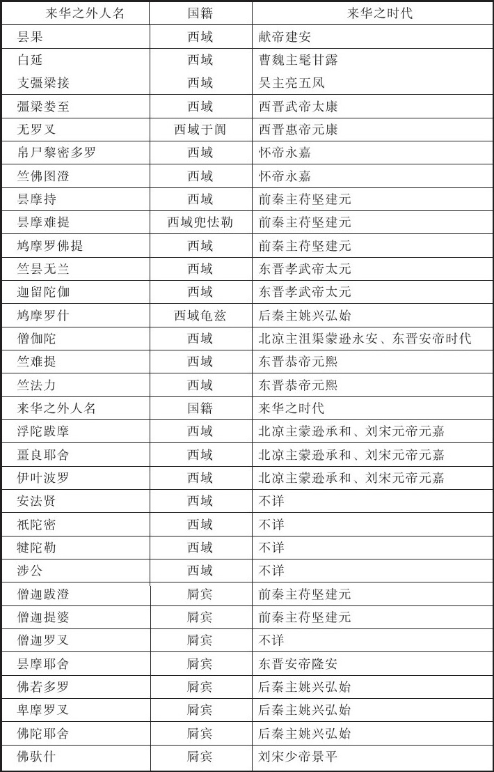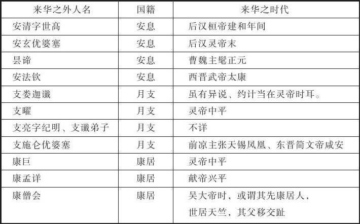 佛经传译之初期,指鸠摩罗什前后而言。考鸠摩罗什来华,在姚秦弘始三年,距支娄迦谶、安清来时,二百六七十年。今就此期间,列举来华之外人,及其国籍于下: