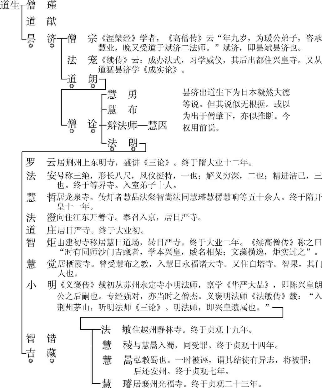 学者有分三论为古三论、新三论者,而以嘉祥以后者为新三论,嘉祥以前者为古三论。古三论若将罗什、道生除外,则以此二人非三论空宗人。古三论之教义,颇难索解。盖系统者,自来学者所传而成,若传记不详其姓氏,著述又多阙略,尚何系统之足云。相传三论宗,经罗什、道生传至昙济。《高僧传》仅载昙济著《七宗(或家)论》,其书今亦不存。或谓道朗为昙济弟子,朗之事迹亦无传。但《大乘玄论》卷一二谛义所载,有足据者。文曰: