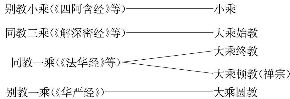 其意以为小乘、大乘始教、终教、圆教,与天台之三藏教、大乘通教、别教、圆教相同,法藏不过加顿教为五教,此举殊乏意义。何则?法藏之顿教,乃指口不得言心不得虑之绝对真理,实是理而非教;不可与能说之教小、始、终、圆,视同一律。若亦得谓之教,则大乘佛教之极致,皆不得不谓为顿教。此慧苑所以不满于五教,而别立四种教之判释也。(四种教,载在第十三章之二。)
