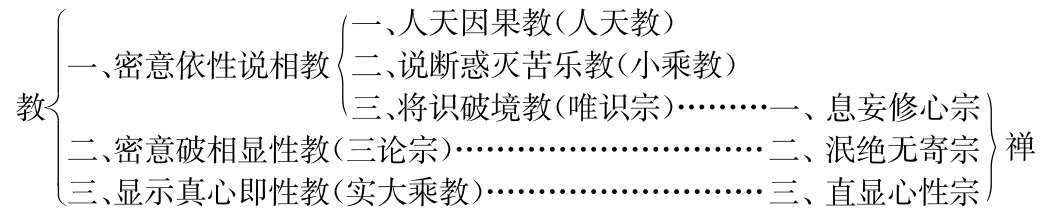 今由《禅源诸诠集》以述其禅教一致论之要旨,盖宗密立禅,区分三种,(此三种禅,已述于禅宗项下。)而谓与之相应之教,亦有三种。兹将禅教之配置述之于下: