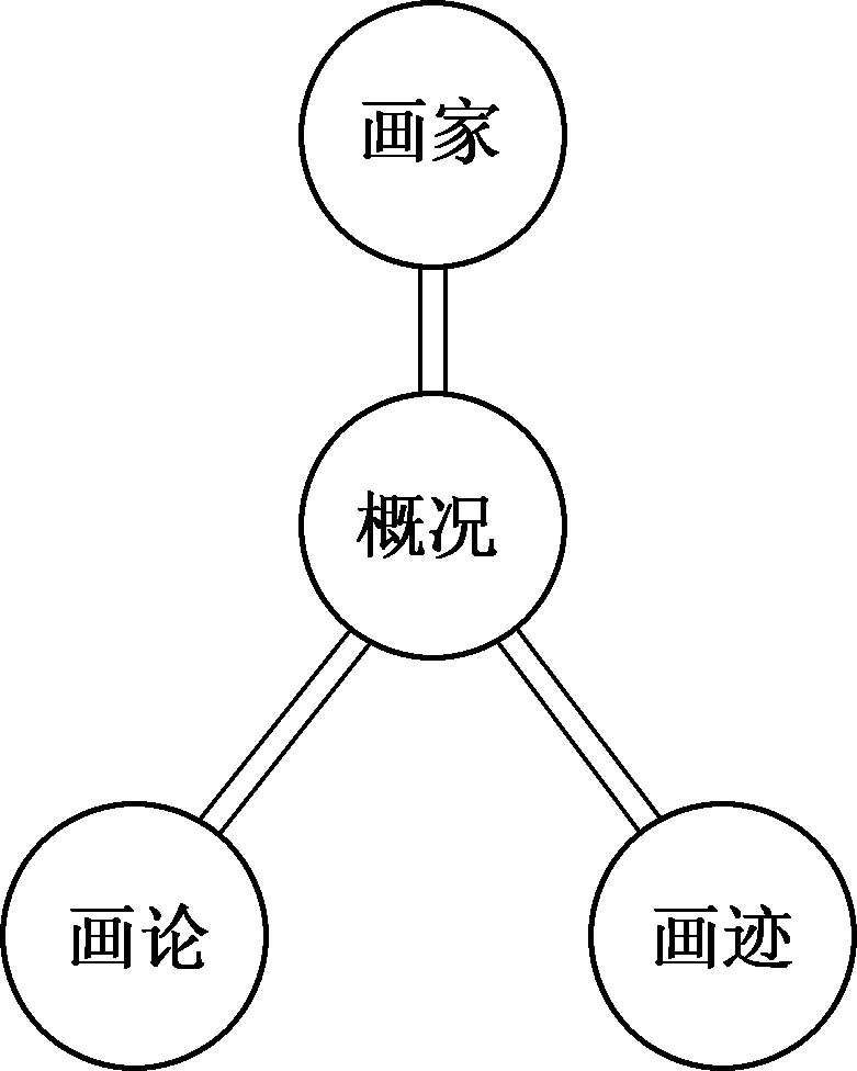 四者互可质证,互有发明,不能偏废。然按其实际,可分为二组:概况为一组;画迹、画家、画论为一组。前者系后者撮要之叙述,后者系前者分股之详解。读者既读概况,欲更为详实之研究,则可读以下三节。兹将四者相关之程式,略以图示。