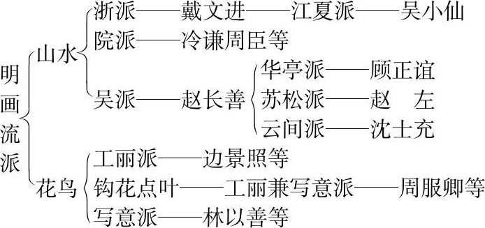 明代山水画,竞尚摹仿,号为名家者,其画要皆有所师法。自明初而至嘉靖间,近嫌元季画风放逸,而远喜南宋院体之整美。学者往往宗法刘、李、马、夏;其师董、米及元季四家者,虽亦有人,然多无大名。如冷谦、周臣、唐寅、尤求、石锐诸家,皆为学刘、李之高手。戴进、倪端、李在、周清、吴伟、张乾、朱端,则皆传衣钵于马、夏。而学盛懋法者,如郭纯、苏复、赵友、顾叔润等,亦不在少数。其后画院不振,士夫如沈周、文徵明等,已以其雄浑温雅之笔墨,树其声势于正德、嘉靖之际。继至崇祯中,有董其昌、陈继儒辈,复以其崇望硕德,大张旗鼓于后。于是远而荆、关、董、巨,近而倪、黄、吴、王之画派,复代马、夏派而大盛。总之:嘉靖以前,山水画家概从南宋院体,其绍述马、夏遗规,略变其故有浑厚沉郁之趣,而为劲拔者,其结果乃有浙派之成立。其绍述刘、李遗规,略于故有细巧浓丽之中,稍变秀润者,其结果乃有院派之复延。一般士大夫之雅好画事,群持荆、关、董、巨之帜相号召,而与盛极就衰之浙派、院派之末流争光者,其结果乃有吴派之继起。故明代山水画,以流派论,凡三:曰浙派、院派、吴派。而考其消长之迹,则可分为二期:国初至嘉靖间为前期,浙派、院派并行之时也;嘉靖而后,则让吴派独步矣。试就各派而述之: