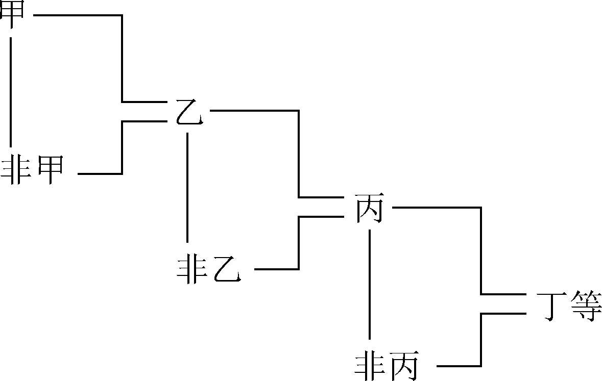 三曰无抗论别择之风也。希腊哲学之所以极盛,皆由彼此抗辩折衷,进而愈深,引而愈长。譬有甲说之起,必有非甲说随起而与之抗;甲与非甲,辩争不已,时则有调和二者之乙说出焉;乙说既起,旋有非乙;乙、非乙争,又有调和,丙说斯立。此论理学中所谓三断式也。今示其图如下: